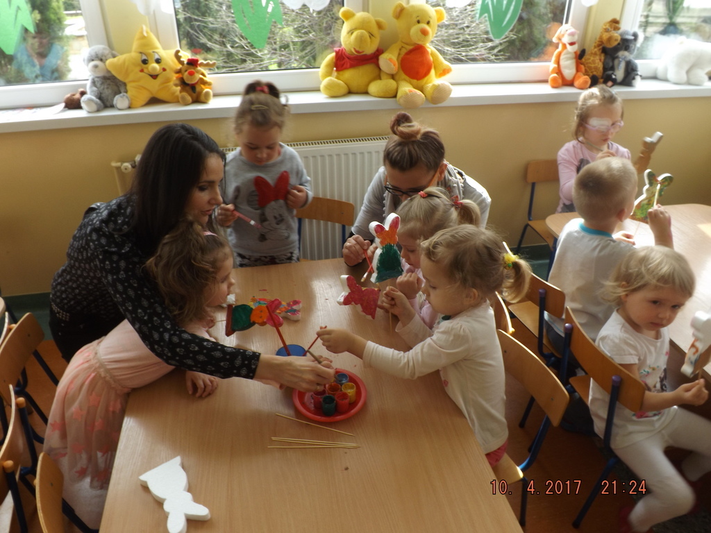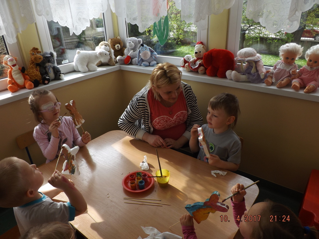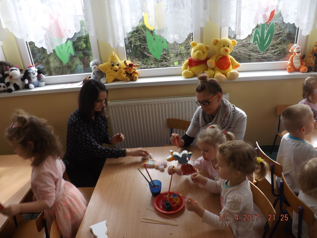 W dniu 11 kwietnia 2017r. w grupie Sówek miało miejsce niezwykłe wydarzenie. Dzieci na sali odkryły tajemnicze ślady. Idąc za tropem stwierdziły, że był u nich Zajączek Wielkanocny. Wyjątkowy gość zostawił przedszkolakom list, w którym zlecił wykonanie świątecznych zadań oraz nagrody niespodzianki. Przedszkolaki z przejęciem i wsparciem rodziców podjęły się wykonania poleceń. Zrobiły to z dużym zaangażowaniem. Za dobrze wykonane zadania otrzymały słodkie nagrody od Zajączka Wielkanocnego.